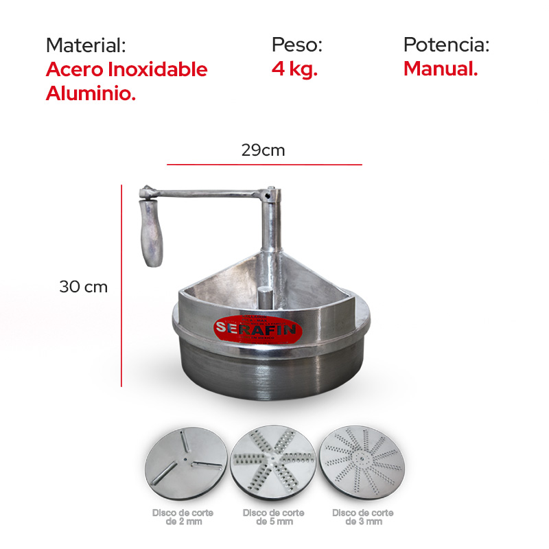 Material: Fabricado en acero inoxidable y aluminio, con 3 discos de acero inoxidable para un proceso de corte diferente.